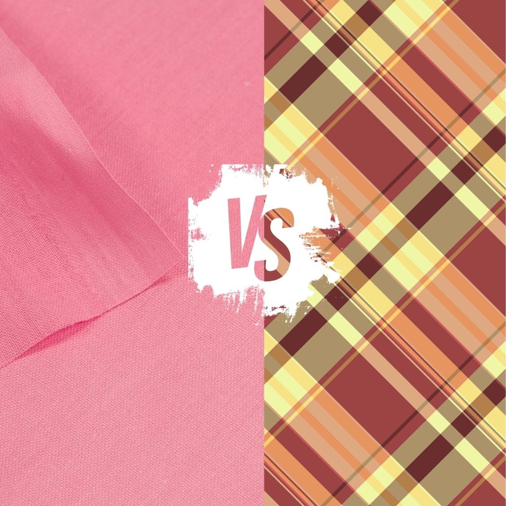 Pink fabric versus plaid pattern — a bold ‘VS’ divider in the center.