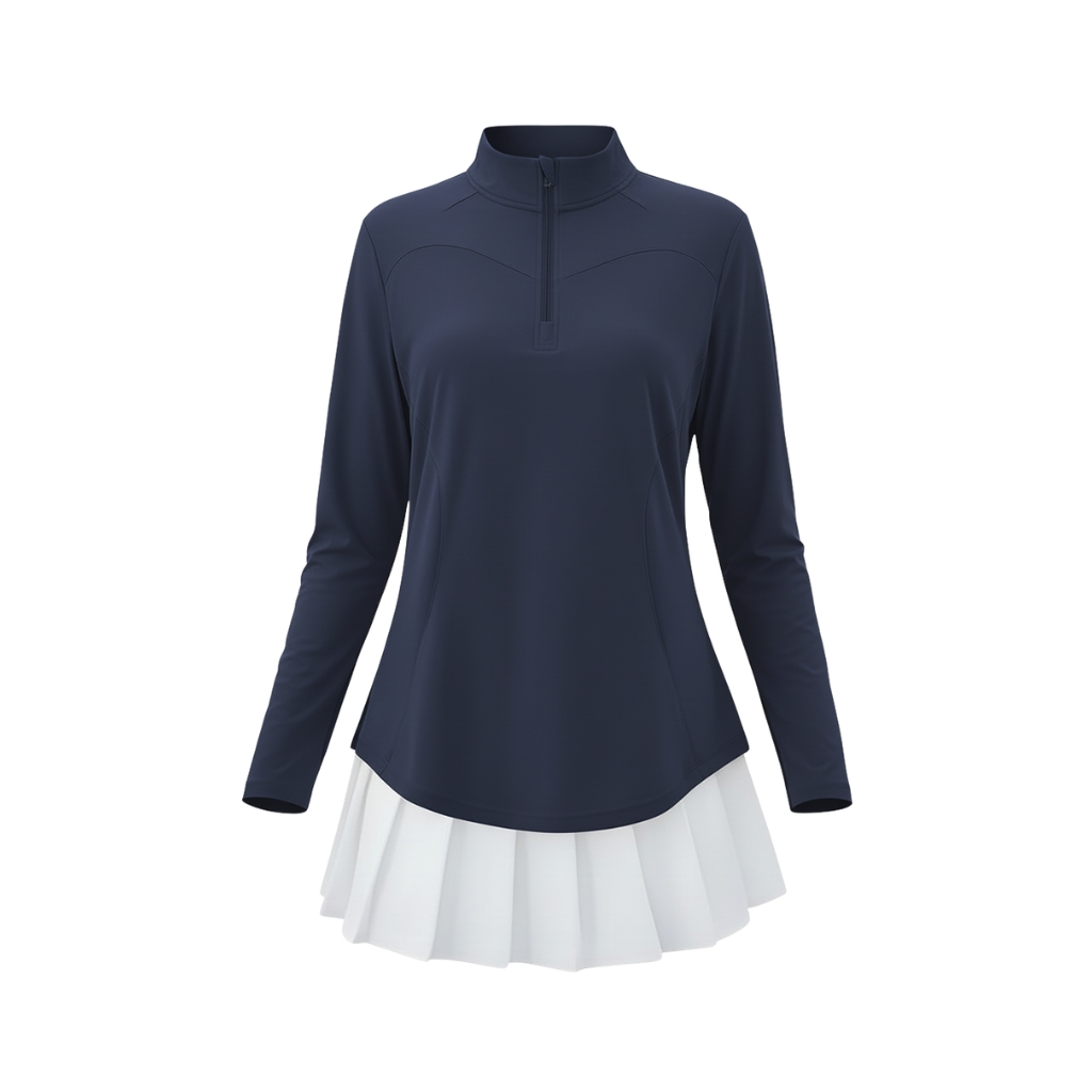 Navy long-sleeve golf top with a white pleated skirt on the golf course.