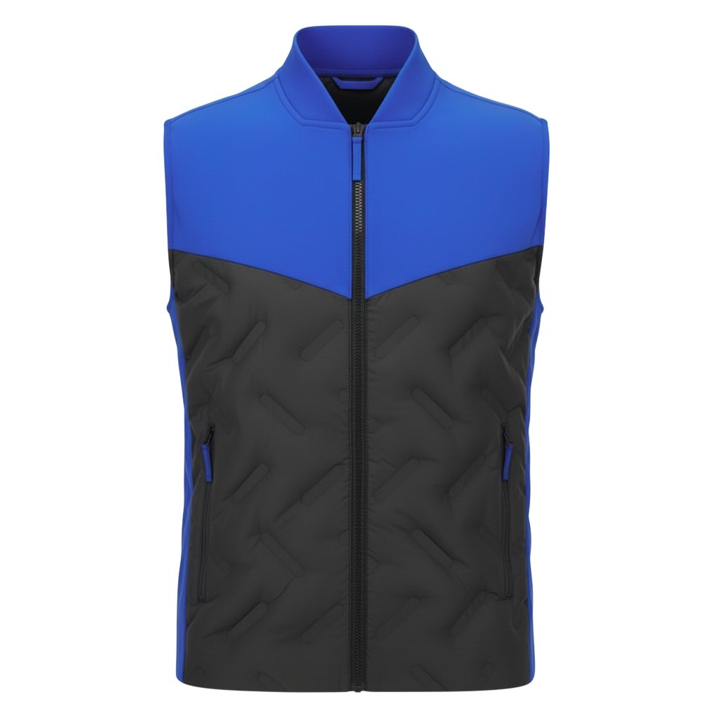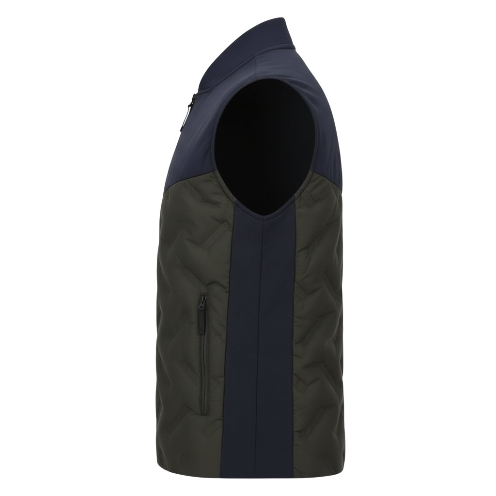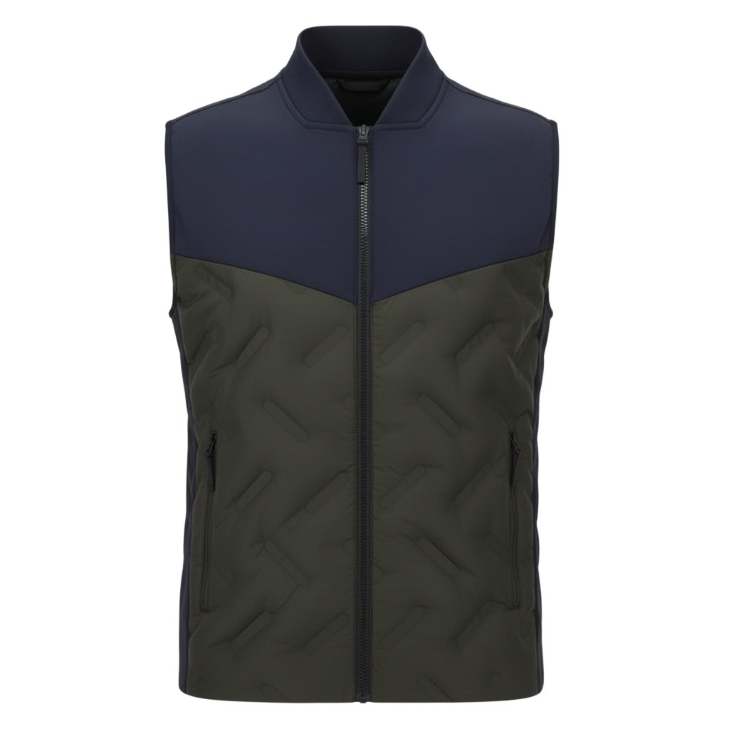 Dark navy men’s rugby vest jacket with quilted contrast panels and zip-front design