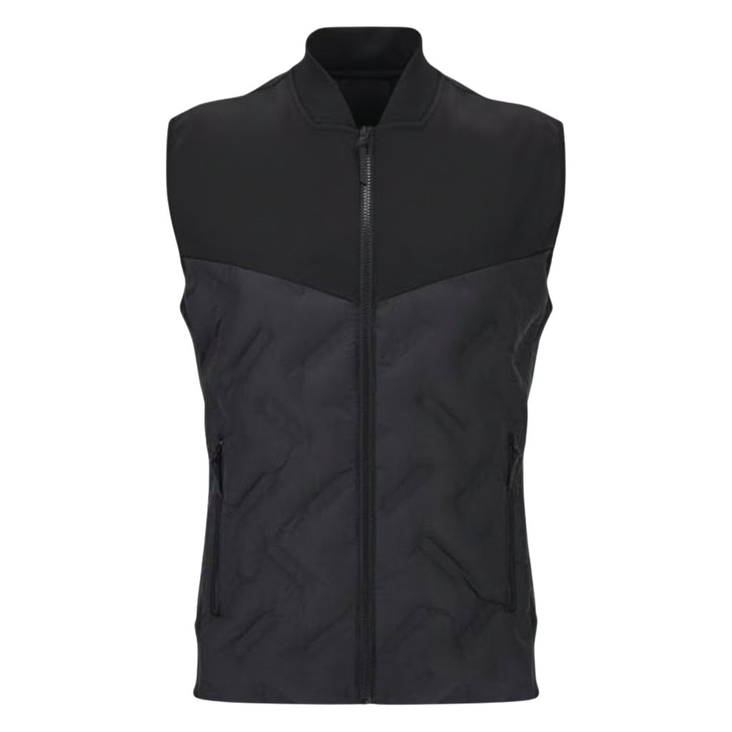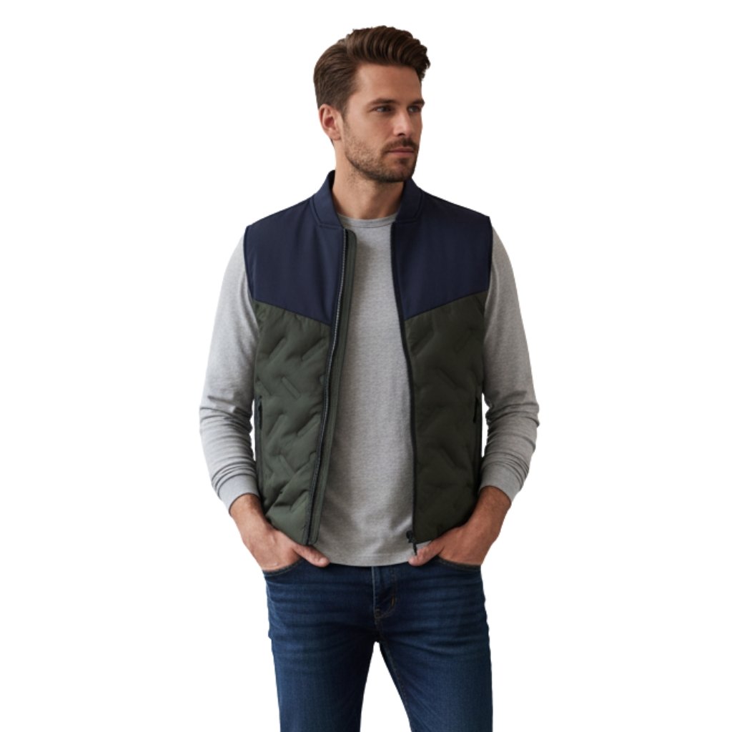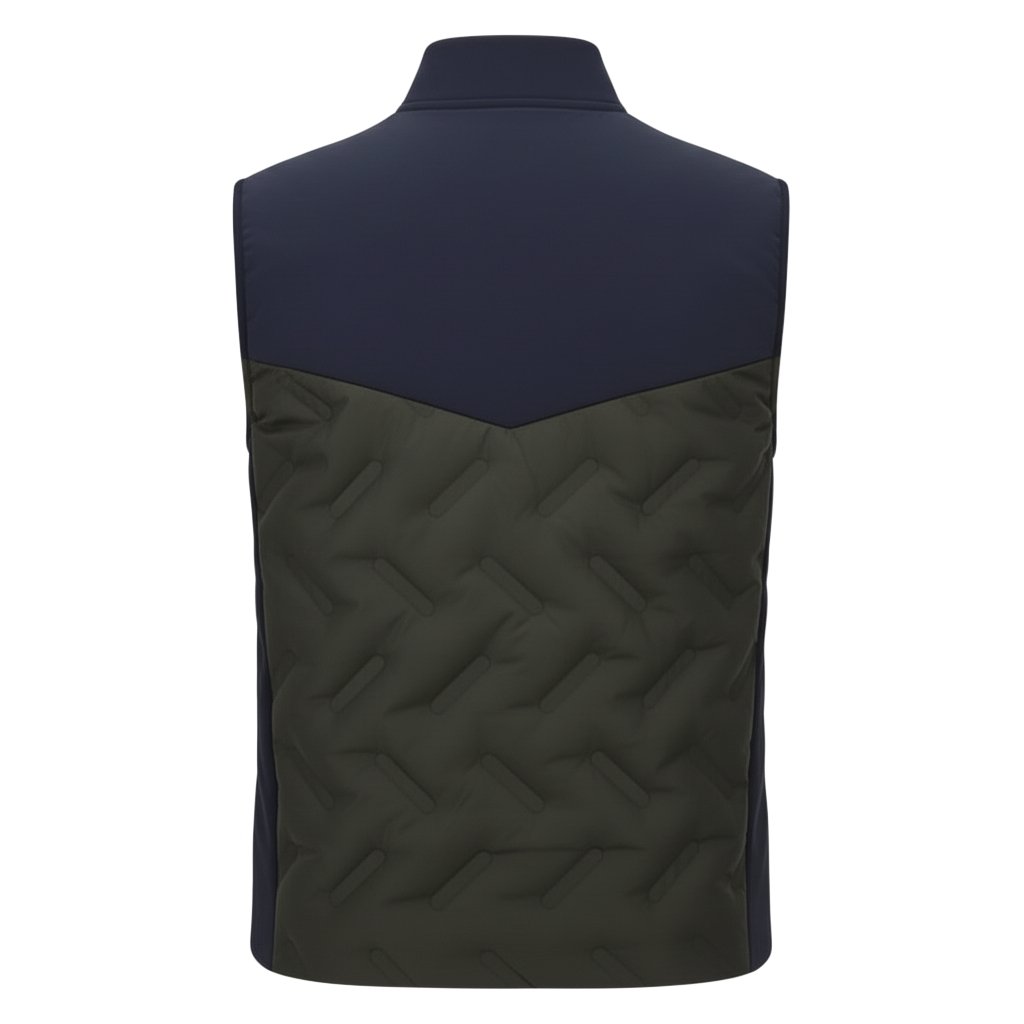 Dark navy men’s rugby vest jacket with quilted contrast panels and zip-front design