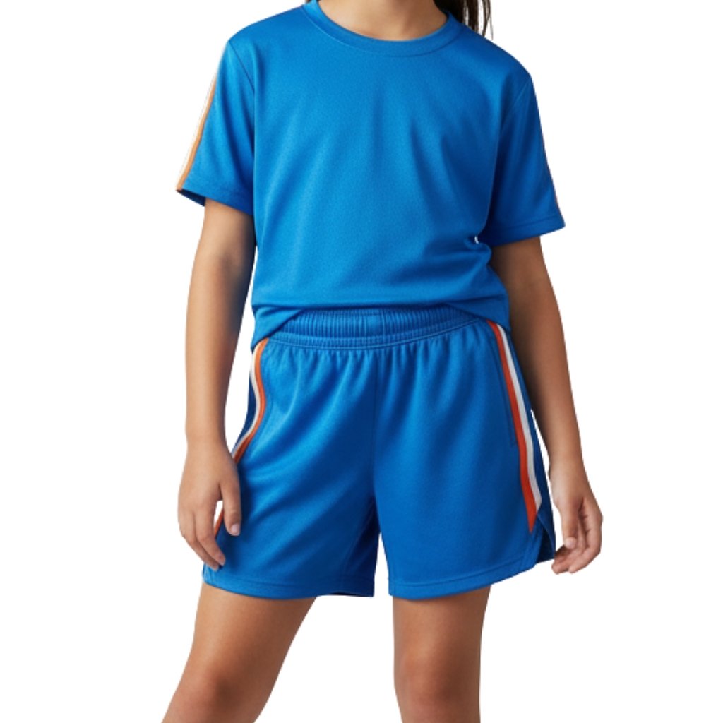 Blue sleeveless athletic top and blue basketball shorts with elastic waistband and orange-and-yellow stripe accents, pictured standing outdoors while holding a basketball