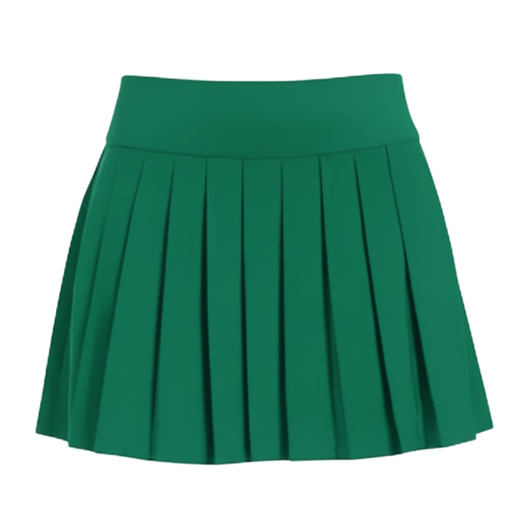 Woman golfer mid-swing on a sunny green golf course, wearing a white top, green visor, and a pleated green golf skirt.