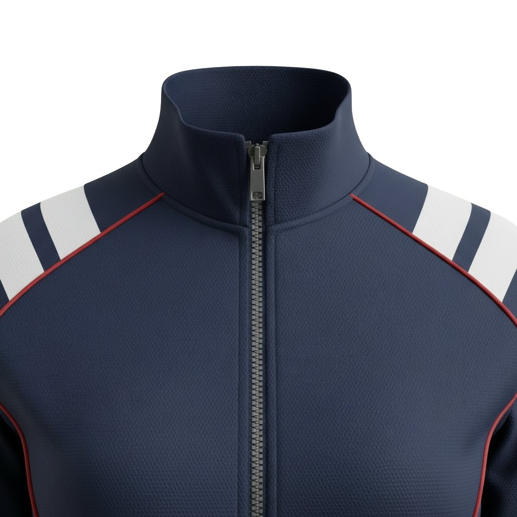 Power in motion: Our navy blue rugby tracksuit jacket merges athletic precision with unwavering strength. White stripes trace the path of movement across your shoulders and arms, while bold red piping defines every seam — because intentionality shows in the details.